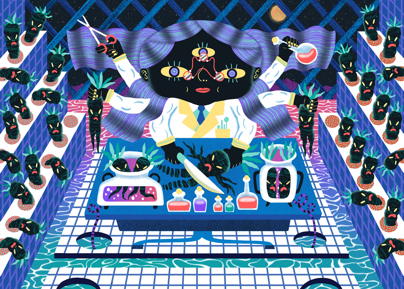 As part of The Garden of Mischief series, this image illustrates the gardener, who overlooks the garden, working at the lab.